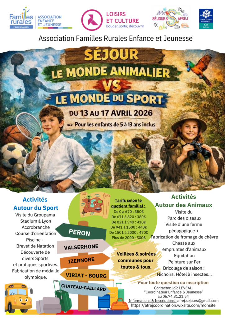 L’AFREJ (Association familles rurales) lance les inscriptions pour un prochain séjour de printemps au profit des enfants âgés de 5 à 13 ans qui aura une double thématique favorisant le choix des enfants (A préciser impérativement lors de l’inscription)