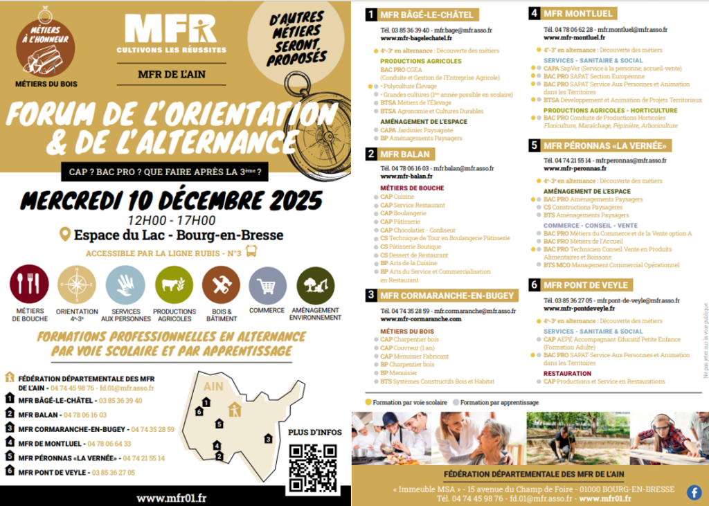 Vous trouverez ci-dessous le flyer du FORUM de l’orientation et de l’alternance des MFR de l’Ain qui aura lieu le 10 décembre à Bourg-en-Bresse :